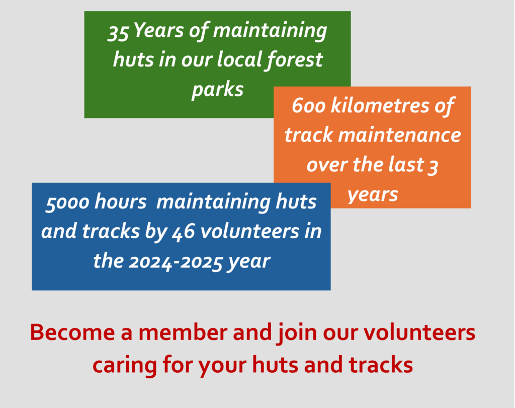 We have made good progress and over the last three years, we have put considerable effort into catching up with deferred maintennce of tracks. All huts we look after in good shape also. This is thanks to our keen members who volunteer to help make a difference so forest park users can have an enjoyable experience. Also to the generocity of charitable groups that have provided funding grants to ensure we can get the work done. And also the individuals and clubs that have donated funding to the GWBN.